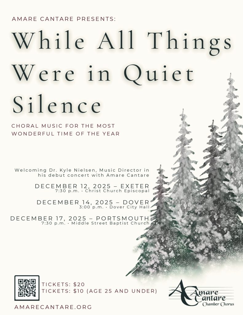 Amare Cantare’s holiday concerts highlight the sacred and special found in the silent moments during the Most Wonderful Time of the Year. The program features unaccompanied choral music offering perspectives from a variety of eras, nations, and life experiences, juxtaposed with both timeless and timely texts. From the titular While All Things Were in Quiet Silence by Ned Rorem to beautifully paired settings of Ave Virgo Santcissima by Francisco Guerrero and David Azurza and A Spotless Rose by Herbert Howells and Becky McGlade, hear beloved carols in arrangements both traditional and unexpected.